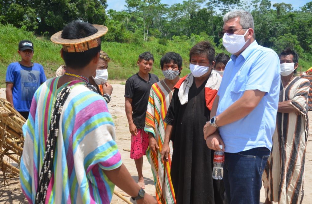 O secretário Mauro Sérgio Cruz (SEE), acompanhado do chefe de Departamento de Educação Indígena da SEE, Nilo Barreto, tiveram a oportunidade de conversar com lideranças dos Ashaninkas do alto Envira e também dos Madjas (Kulinas), que estão acampados próximos ao município de Feijó.