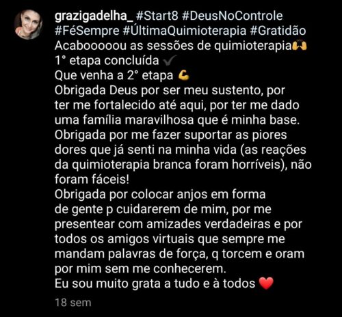 Na sua última publicação no dia 22-06-2020 Graziela escreveu: