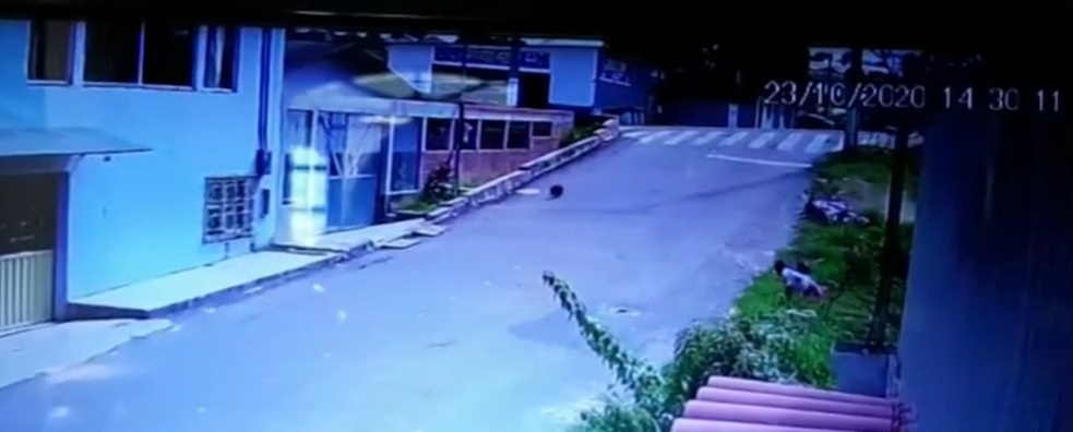 O condutor da moto foi arremessado, jogado para o outro lado da rua, alguns metros a frente da motocicleta. Logo em seguida ele se levantam pega o capacete e sai andando.