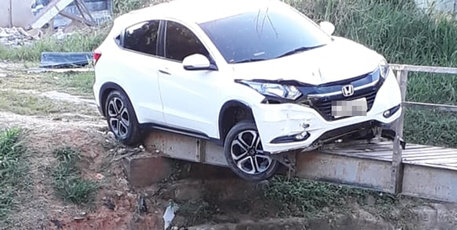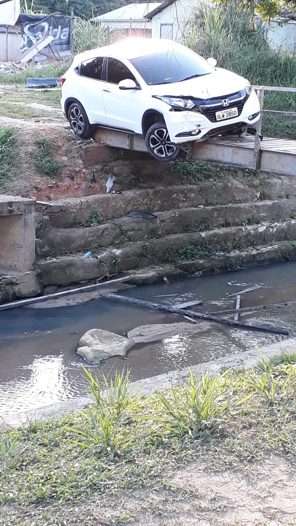 Nas imagens é possível ver que o veículo quase cai no córrego, abaixo da passarela que foi construída especificamente para pedestres.