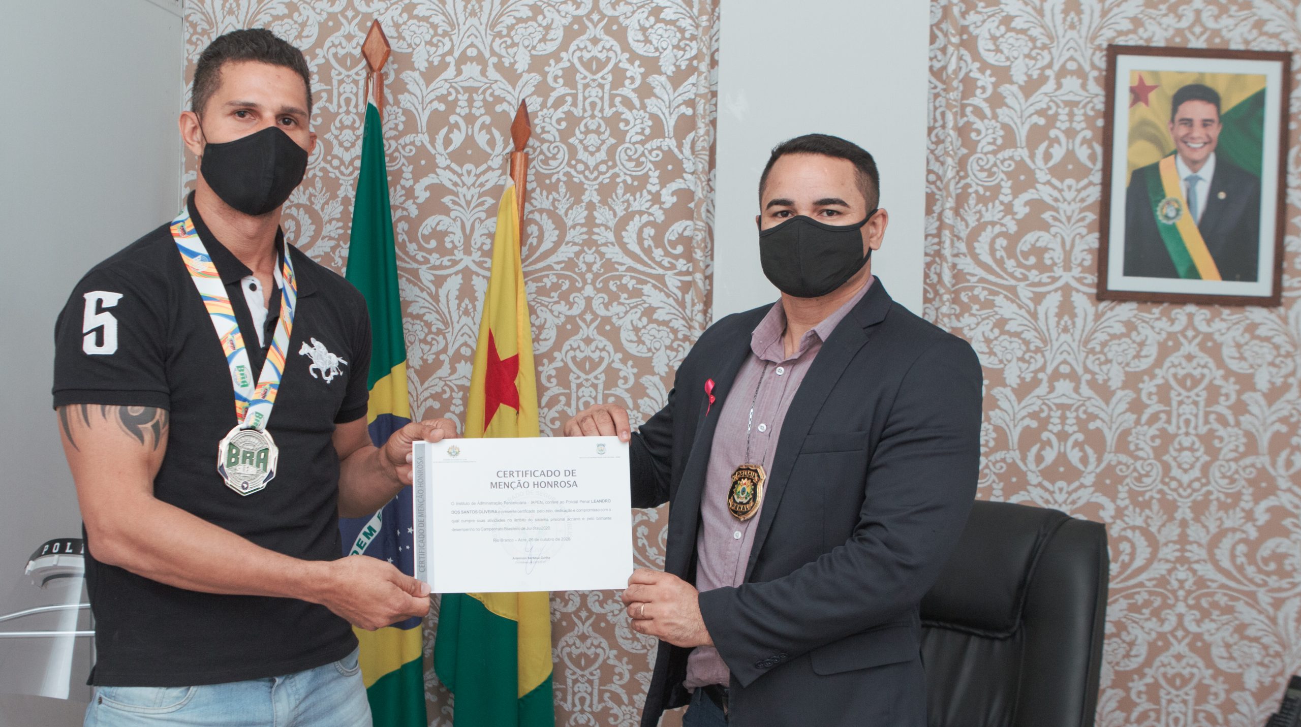 Na ocasião, o policial penal recebeu um Certificado de Menção Honrosa pelo zelo, dedicação e compromisso com o qual cumpre as atividades no âmbito do Sistema Prisional acreano e pelo desempenho no Campeonato Brasileiro de Jiu-Jitsu 2020.