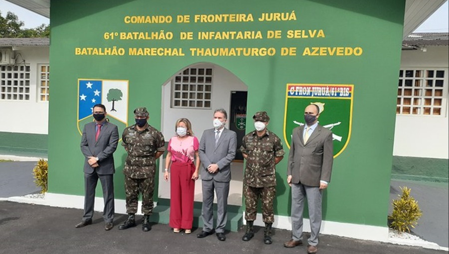 A presidente do Tribunal Regional Eleitoral do Acre (TRE), Denise Bonfim, e o vice-presidente e corregedor da Corte, desembargador Luiz Camolez, em agenda de trabalho, reuniram-se, na tarde da última quinta-feira, 22, no município de Cruzeiro do Sul, com o comando do 61º Batalhão de Infantaria de Selva, representado, na ocasião, pelo seu subcomandante, tenente-coronel Kenzo, e pelo major Vinícius.