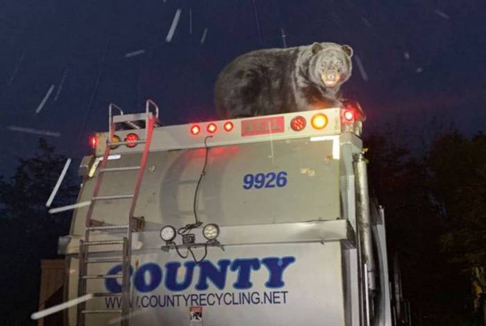 Na última quinta-feira (30), um urso foi visto em cima de um caminhão de lixo na cidade de Kidder Township, no estado da Pensilvânia (EUA). As informações foram dadas pelo portal UOL.