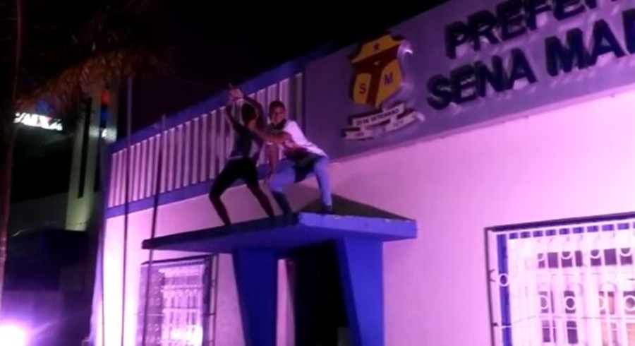 Um vídeo que mostra dois jovens dançando em cima da cobertura de entrada do prédio da prefeitura de Sena acabou viralizando em grupos de WhatsApp e páginas do Facebook.