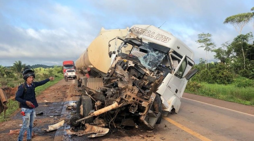 Um acidente na BR-364, em Rondônia, deixou um caminhão-tanque com a frente completamente destruída. As imagens impressionam. Segundo informações repassadas por uma testemunha, o veículo bateu na traseira de um carro toureiro.