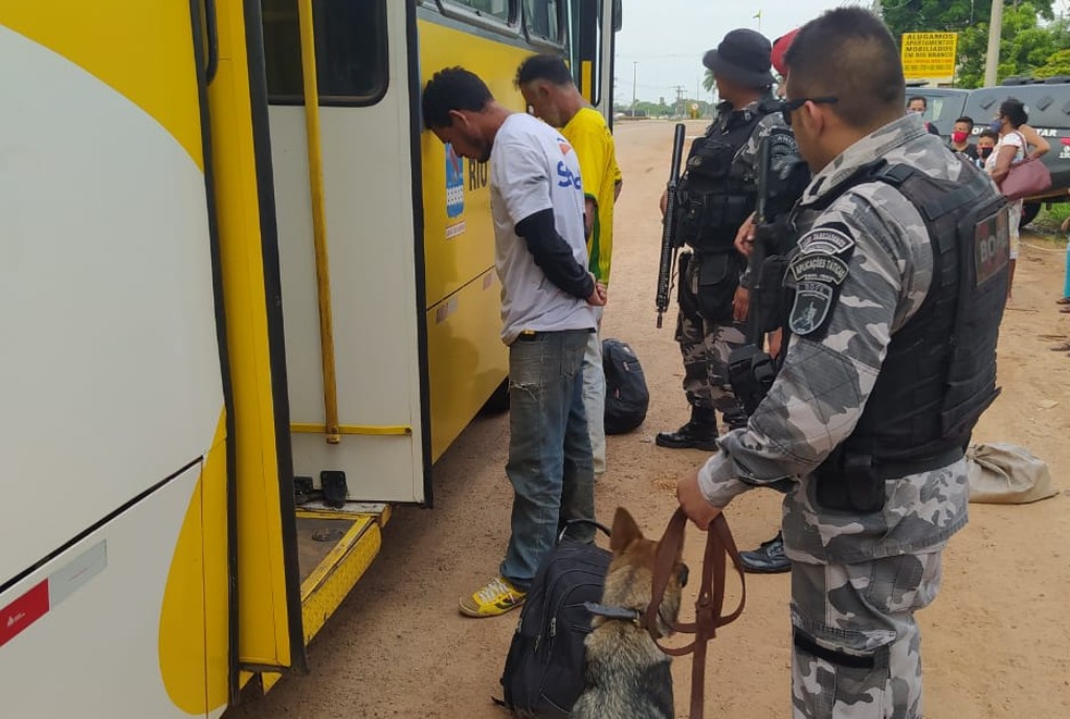 Dois homens foram presos durante uma abordagem a um ônibus da linha Vila Verde, no bairro Plácido de Castro, na rodovia Transacrena, em Rio Branco. Com eles, a polícia encontrou mais de três quilos de maconha, uma arma de fogo e dois animais silvestres.
