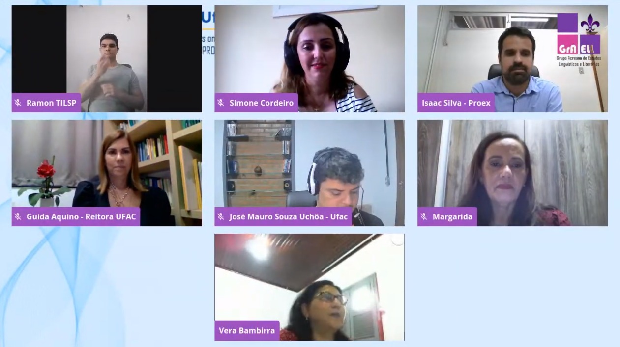 A cerimônia de abertura foi transmitida pelo canal do grupo de pesquisa, via YouTube, em <graell.ufac>, e contou com a presença da Magnífica Reitora, Prof.ª Dr.ª Guida Aquino; a Pró-Reitora de Pesquisa e Pós-Graduação, Prof.ª Dr.ª Margarida Carvalho; o Pró-Reitor de Extensão e Cultura, Isaac da Silva; o Diretor do Centro de Educação e Letras, Prof. Dr. Mauro Uchôa; a coordenadora do evento e líder do GrAELL, Prof.ª Dr.ª Simone Cordeiro; a vice-líder do GrAELL, Prof.ª Dr.ª Vera Bambirra.