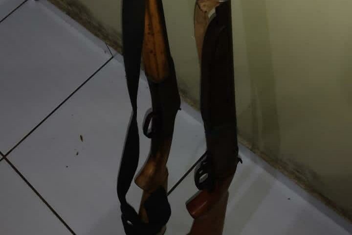 Os militares foram acionados via 190, com informações de que um indivíduo estaria armado e teria agredido a esposa e os dois enteados. Os militares montaram o cerco e conseguiram prender o homem com duas espingardas, uma calibre 20 e outra de calibre 28.