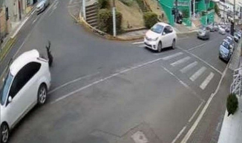 O carro que vinha logo atrás na rua diminui a velocidade e para no meio da rua. A mulher levanta sozinha e sai caminhando. O Focus, de onde a mulher pulou, seguiu viagem sem prestar socorro e saiu do ângulo da câmera.