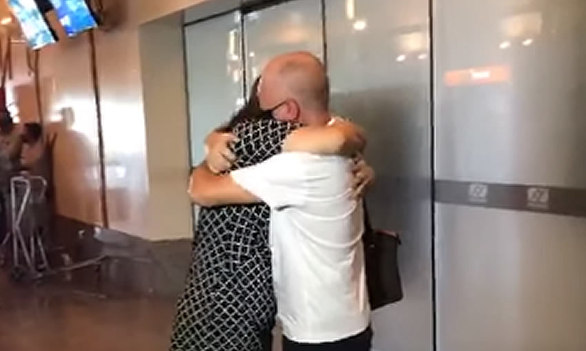 Assim que surgiu no portão de desembarque, Gonzaga acenou com a mão e se dirigiu à esposa, Vânia Maria. Em um clima de bastante emoção, ambos se abraçaram demoradamente, enquanto os cristãos aplaudiam e cantavam hino em ação de graças pela saúde do líder espiritual.