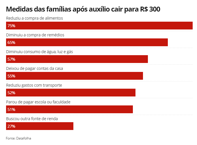 Com a redução do valor do voucher, 75% das famílias reduziram a compra de alimentos, e 65% diminuiu a compra de remédios. Veja as principais mudanças: