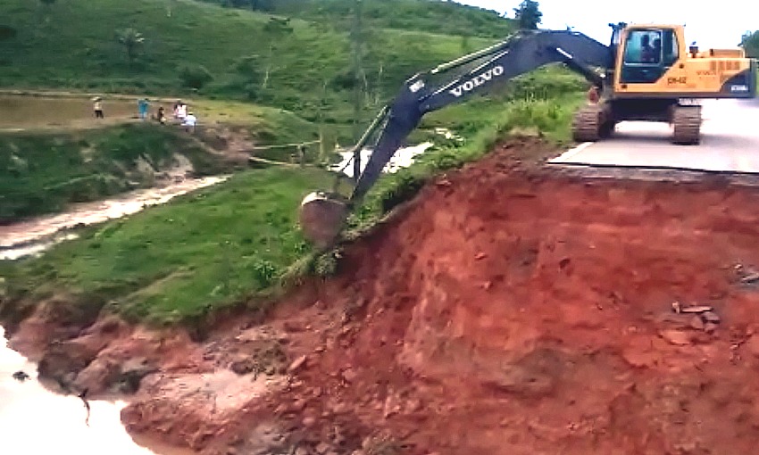 A recuperação da rodovia que está sendo feita com tubos para a vazão da água e pedras para a construção de um aterro. Os tubos e parte das pedras foram cedidas pelo governo do Estado e o material foi transportado de Rio Branco para o local do serviço.