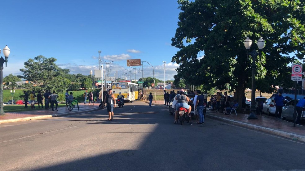 O ato faz parte da greve da categoria para cobrar os salários atrasados. Desde a segunda-feira (14), o transporte coletivo está parado e mais de 20 mil usuários estão sendo prejudicados.
