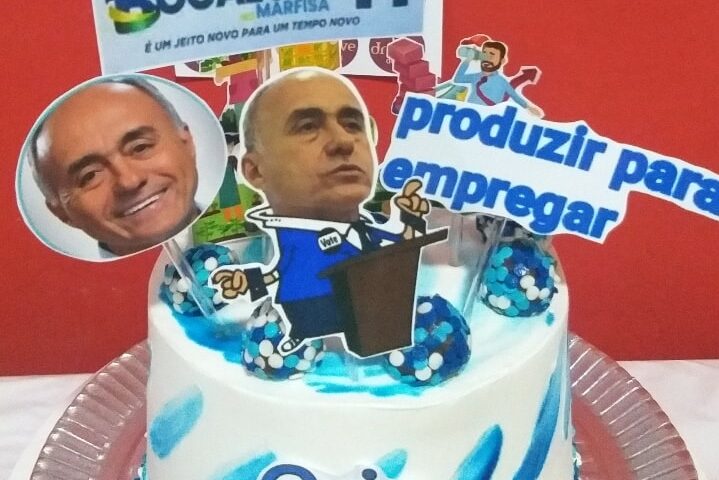Ela fez um bolo com topos de imagens do fã do garoto: o futuro prefeito de Rio Branco, Tião Bocalom.A imagem pode conter: 2 pessoas, comida