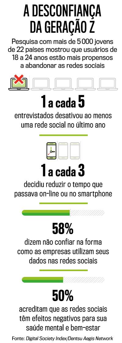 “Meu conselho é: se puder sair das redes sociais, saia”, cravou Tristan Harris, ex-funcionário do Google, em entrevista a VEJA em setembro. Ele está no documentário da Netflix O Dilema das Redes, que detalha os riscos à privacidade das pessoas, que, em sua visão, acabam virando produtos do Facebook, Instagram, Twitter e outros. Se for tomado por base o estudo realizado pela agência de pesquisa Dentsu Aegis Network, muita gente já estava dando ouvidos ao conselho de Harris antes mesmo de ver o documentário. Foram entrevistadas 32 000 pessoas em 22 países, em março e abril, e o resultado foi surpreendente: entre os jovens de 18 a 24 anos, a Geração Z, um em cada cinco afirmou ter desativado suas contas na redes sociais.