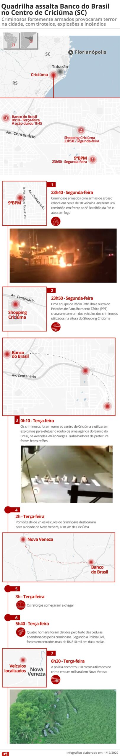 - Cerca de 30 pessoas encapuzadas assaltaram uma agência do Banco do Brasil no Centro de Criciúma às 23h50 de segunda-feira (30). A ação durou 1 hora e 45 minutos.