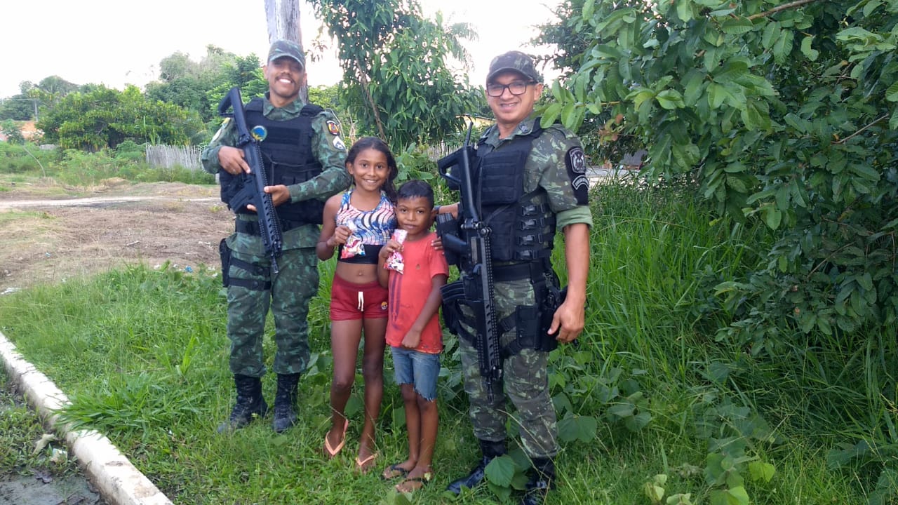Na ação, os policiais entregaram bombons e chocolates para as crianças da comunidade.