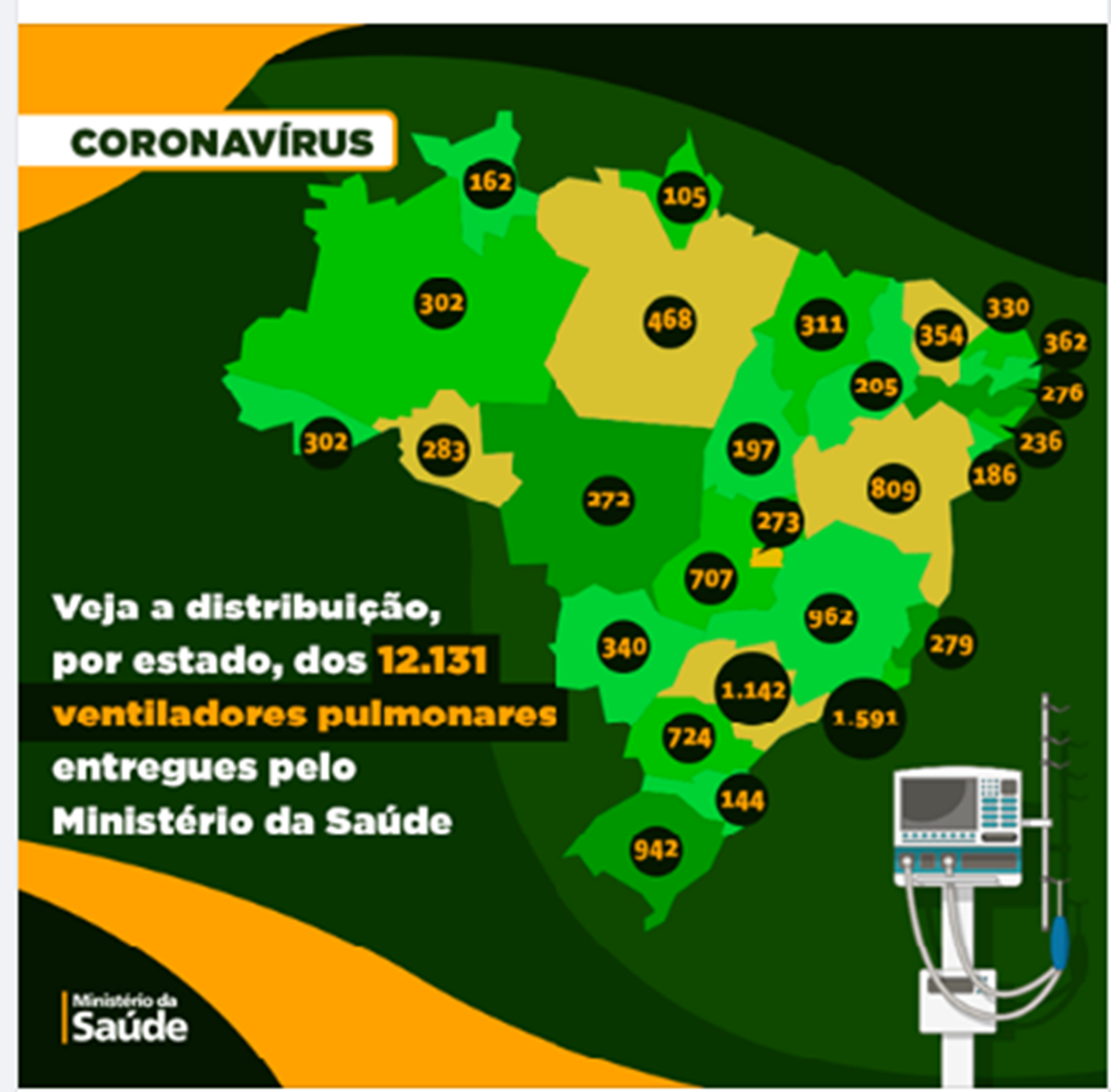 O Ministério da Saúde atualizou neste sábado (12) o mapa de distribuição dos ventiladores pulmonares usados no tratamento da Covid-19. Para o Acre, segundo o MS, já foram enviados 302 ventiladores.