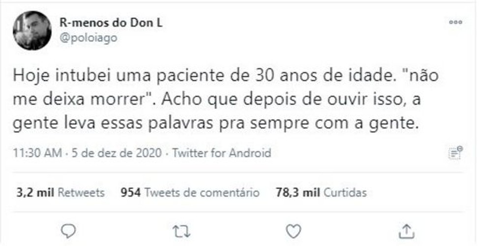 No sábado (05/12), Polo escreveu sobre o apelo da mulher para permanecer viva. “Acho que depois de ouvir isso, a gente leva essas palavras para sempre com a gente”, publicou o médico em seu perfil no Twitter.Formado há um ano, médico Iago Polo relatou em seu Twitter uma das situações mais emocionantes que presenciou desde o início da pandemia de covid-19 — Foto: Arquivo pessoal/via BBC