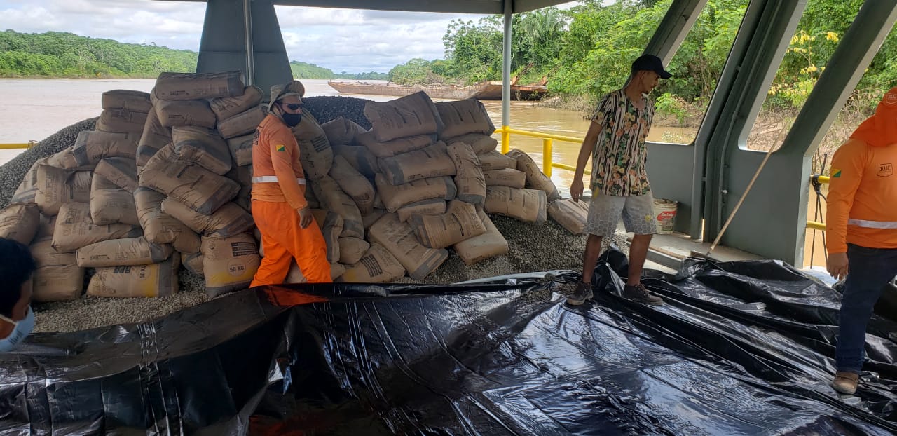 Nessa primeira viagem, serão transportadas 130 toneladas de brita, cimento e areia. A viagem completa durará dois dias. As balsas desembarcarão os insumos e retornarão para realizarem novas viagens.