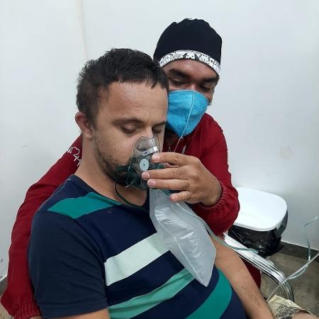 Ao ver o desespero do paciente Émerson Júnior, 30, que temia o uso da máscara com oxigênio, o enfermeiro Raimundo Nogueira Matos, 38, chegou próximo para ganhar confiança e, abraçados, conseguiram fazer o procedimento.