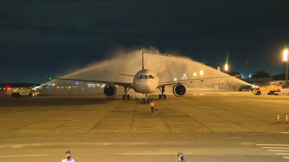 Ainda na pista, a aeronave foi recebida numa cerimônia de “batismo” por dois caminhões do Corpo de Bombeiros, que esguicharam água no avião.