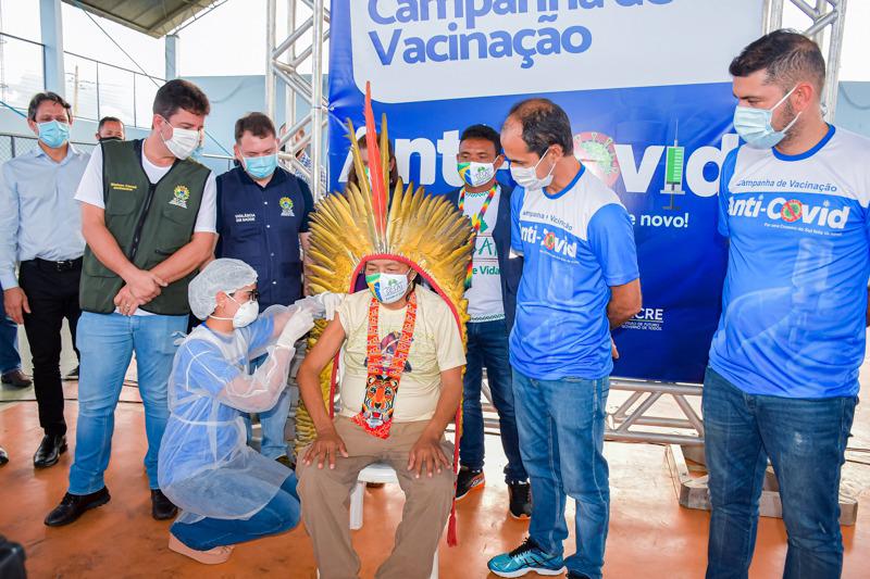 O índigena Fernando Katukina, de 55 anos, foi o primeiro a ser vacinado pela enfermeira Daniele Lima do Programa Nacional (PNI) de Imunização juntamente com mais cinco pessoas do grupo prioritário, profissionais de saúde e idosos institucionalizados.