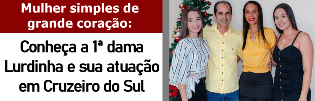 Um verdadeiro exemplo de simplicidade, amor ao próximo e carisma. Essas são palavras que podem descrever a primeira dama de Cruzeiro do Sul Maria de Lourdes Lima Verde, conhecida carinhosamente por Lurdinha. Uma mulher movida pela fé em Deus e pelo amor ao próximo, que leva sua vida baseada em princípios cristãos e respeito mútuo. Logo no início da gestão, ela já mostra que chegou para fazer a diferença. Frente a ações sociais no município, a primeira dama começa a mostrar trabalho em prol dos menos favorecidos.