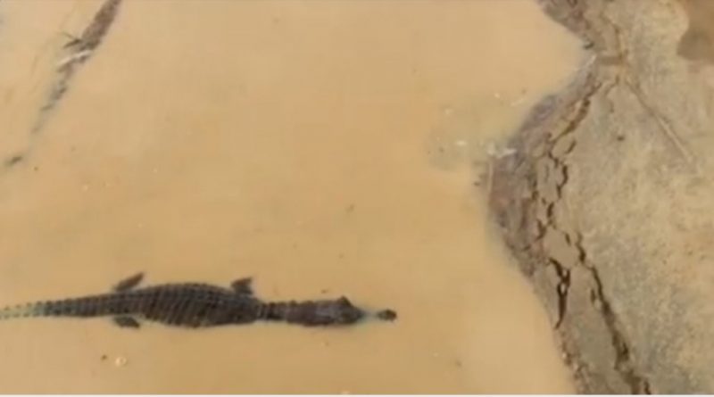 O flagra de um jacaré tomando banho de sol dentro de uma poça d’agua na última terça feira,27, chamou a atenção de Tiago Melo, que passava de moto pelo local. O fato ocorreu na Rua Antônio Lucas, no Bairro Miritizal.
