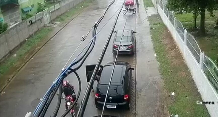 A ação foi registrada por câmeras de segurança e mostra os suspeitos em uma motocicleta aguardando a vítima entrar em um carro e conseguem, com uso de faca ou arma de fogo, levar a bolsa com os pertences da vítima.