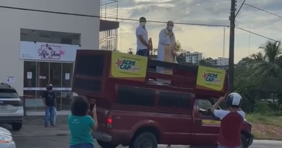 Em um gesto de solidariedade, o bispo abençoou o local com suas palavras. Ele estava em cima de uma caminhonete.