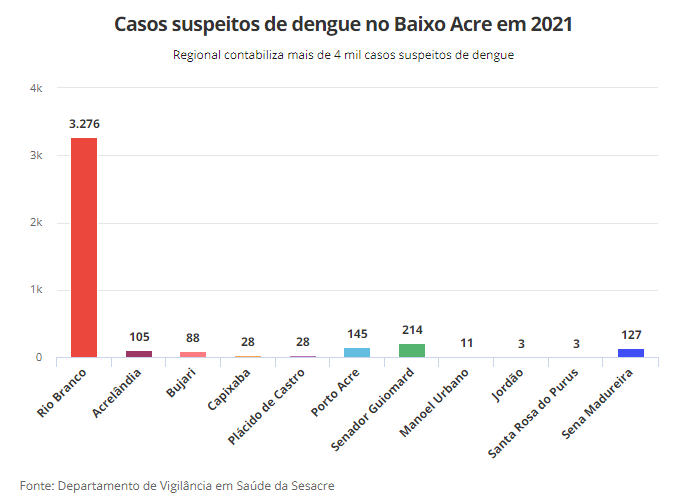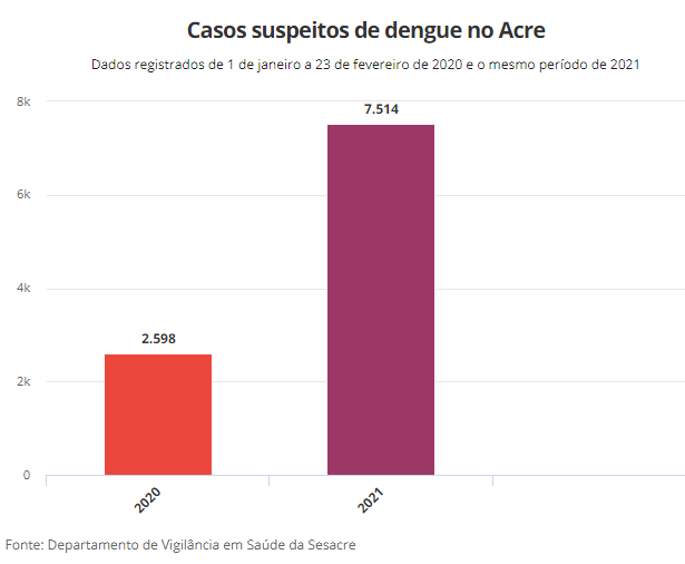 O Acre também registrou 8,6 mil casos suspeitos de dengue em menos de dois meses de 2021.Outro dado que chama atenção é que dos 22 municípios do Acre 20 estão infestados pelo mosquito Aedes aegypti. A capital acreana já declarou situação de emergência devido o aumento no casos de dengue.