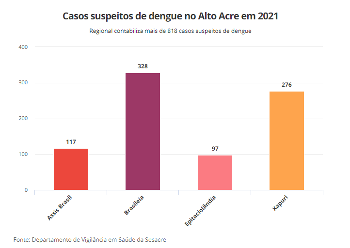 A Regional do Alto Acre soma 818 casos suspeitos de dengue até o dia 23 de fevereiro. A cidade com mais registros é Brasileia, com 328 casos.