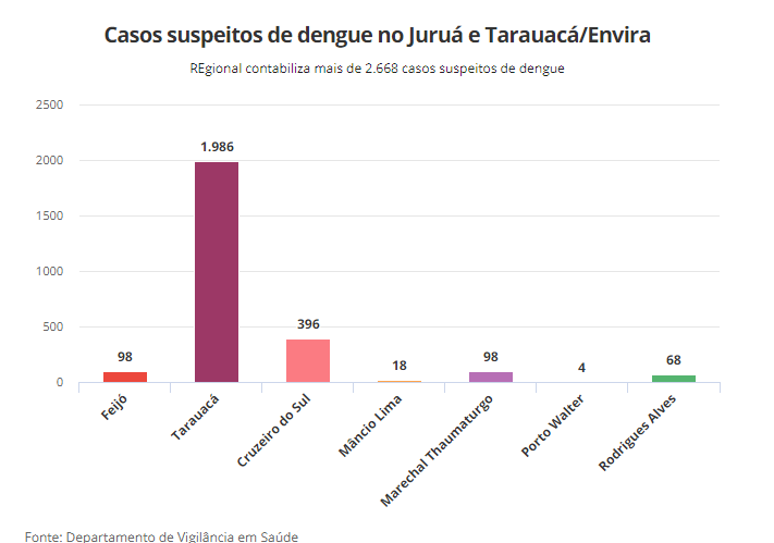 Ainda segundo os dados, as cidades com mais casos suspeitos são: Rio Branco, com 3.276 casos representando 43,6% do total; Tarauacá com 1.986; e Cruzeiro do Sul que já contabiliza 18% dos casos com 396.