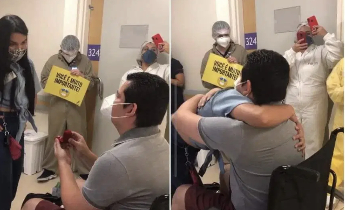 “Era por volta de 10 horas da manhã quando ele me ligou dizendo que teve alta e estava liberado para eu ir buscá-lo no hospital. Não suspeitava de nada. Eu sabia que quando o paciente tem alta, a equipe do hospital faz um corredor de aplausos para comemorar a vitória do paciente contra a covid-19. Nessa hora ele aparece, me chama e eu pensei que era para agradecer por todo o cuidado, mas ele disse que o momento era propício para aquilo, foi assim que aconteceu”, disse Magda, detalhando como o noivo fez o pedido.