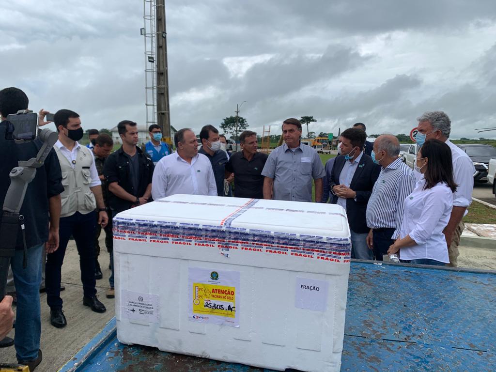 Bolsonaro estava acompanhado do governador Gladson Cameli e dos senadores Márcio Bittar, Mailza Gomes e Sérgio Petecão. O ministro da saúde, Eduardo Pazuello e outros cinco ministros também estão na comitiva.