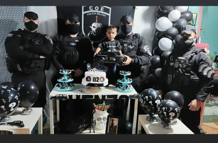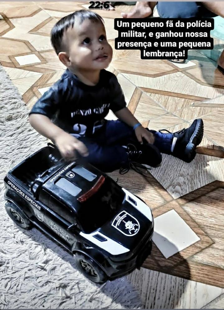 Henzo completou dois aninhos recentemente. Por causa da pandemia, a família celebrou o aniversário em casa, sem festa e aglomerações. Conhecer os policiais, dos quais é fã, foi o grande presente do garoto.