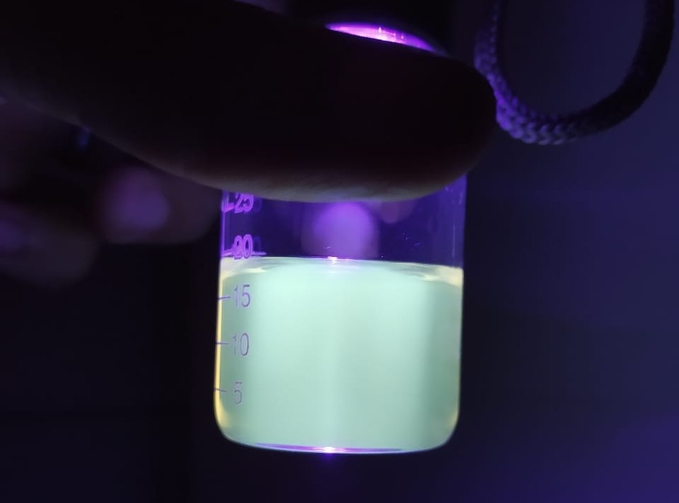 Depois de todo esse processo, esse material é submetido à radiação ultravioleta para ver se ele fica fluorescente ou não.