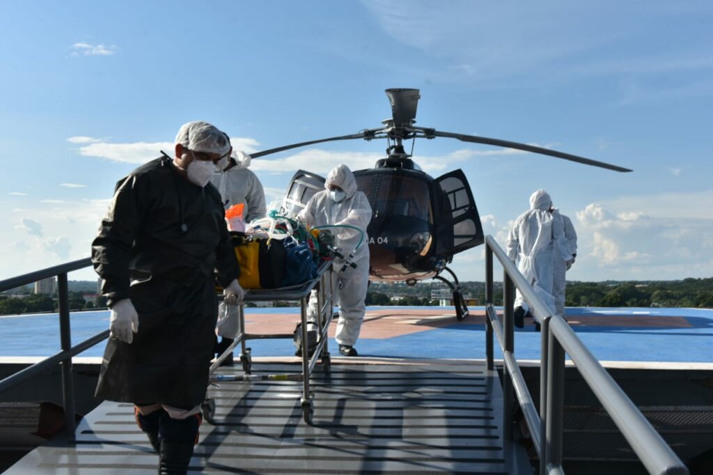 Um paciente acometido pela Covid-19 precisou de transporte imediato, e foi transferido de Brasileia para a capital, Rio Branco. O que levaria horas e poderia ocasionar complicações ao paciente não ocorreu, pois em 40 minutos foi desembarcado no heliponto do Pronto-Socorro de Rio Branco.