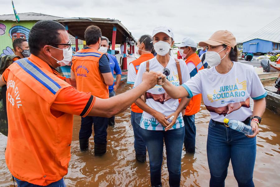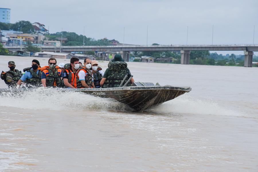 A União entre os poderes municipal, estadual e federal tem sido fundamental para levar ajuda às famílias afetadas pela maior cheia histórica do Rio Juruá, em Cruzeiro do Sul. Na manhã deste sábado, 20, o prefeito Zequinha Lima esteve acompanhado do governador do estado Gladson Cameli e do secretário nacional de Defesa Civil Coronel Alexandre Lucas, em visita as áreas alagadas no Rio Juruá e Moa, onde mais de 8 mil famílias já foram atingidas. Nesta manhã o manancial registrou a marca de 14,33 metros.