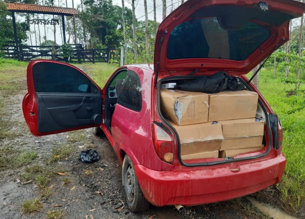 Ao realizar as buscas no veículo abandonado, os policiais encontraram 14 caixas, contendo 700 maços, cada um com 10 pacotes, somando o total de 7 mil carteiras de cigarro de origem paraguaia.