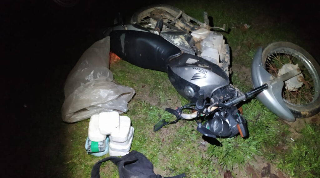 Os policiais interceptaram dois homens em uma motocicleta transportando 8 kg de oxidado de cocaína e 1,1 kg de maconha.