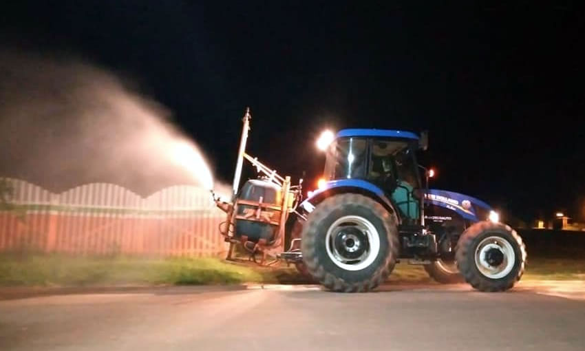 As ações de desinfecção dos locais públicos considerados de alta aglomeração em Porto Acre usam um trator adaptado. O trabalho conjunto da Secretaria Municipal de Saúde e Secretaria Municipal de Agricultura possibilita o uso do trator, que recebeu adaptação, para a desinfecção dos locais borrifando mistura de água e cloro.