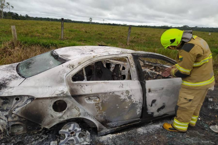 Militares do 4º Batalhão Especial de Proteção e Combate a Incêndio Florestal (BEPCIF) atenderam ao chamado do COPOM/CZS comunicando incêndio de um veículo na BR-364, Ramal 03, KM 02, distante 45 quilômetros e uma guarnição foi ao local para atender o sinistro.