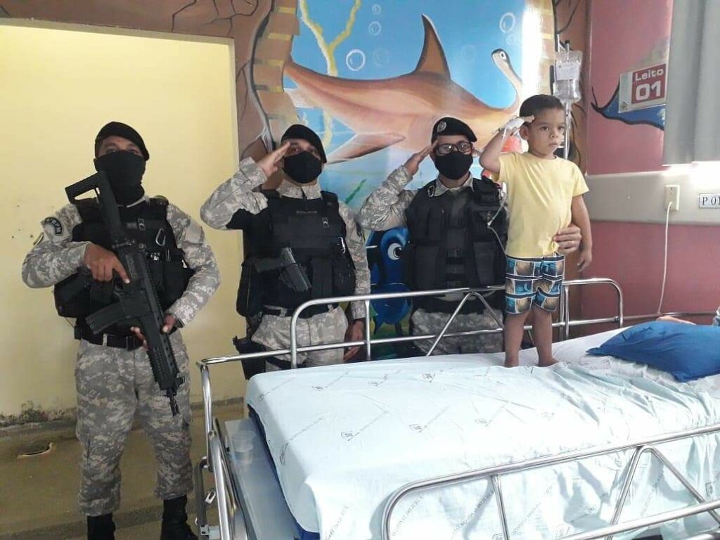 O pequeno Raimundo Taveira, de 3 anos, foi surpreendido nesta segunda-feira, 8, com a visita dos policiais militares do Grupamento de Intervenção Rápida e Ostensiva – GIRO do 6°BPM.