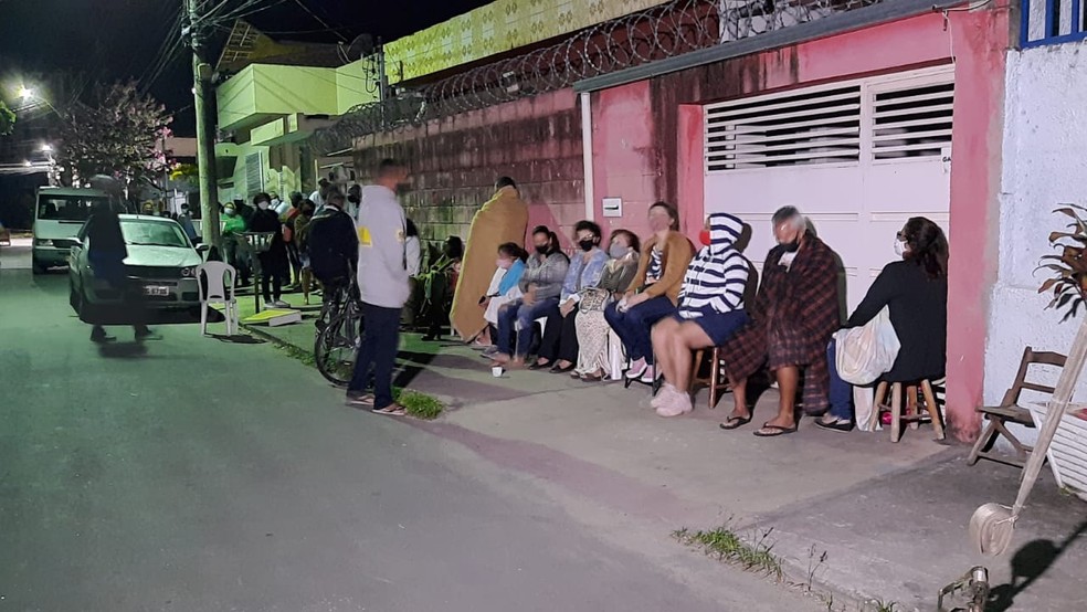 Alguns chegaram ao local às 16h desta quinta-feira (4) para guardar lugar na fila da vacina para esta sexta. De acordo com a prefeitura da cidade, pessoas com 80 a 84 anos poderão ser imunizadas.