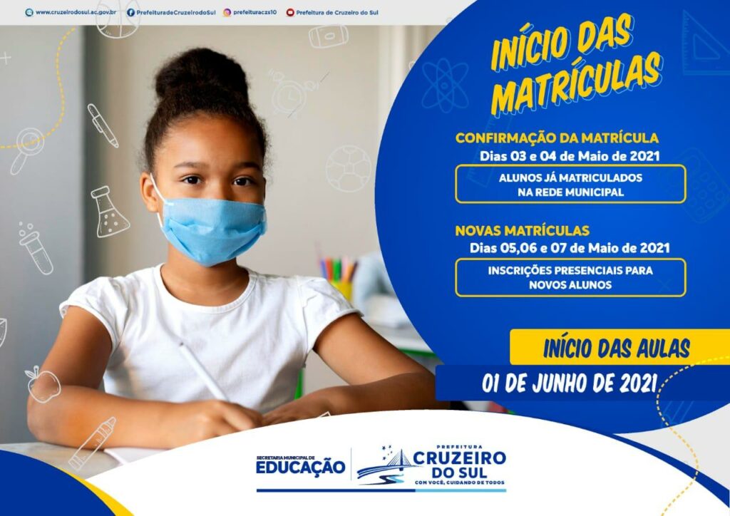 A Secretaria Municipal de Educação de Cruzeiro do Sul encerra o calendário escolar do ano de 2020 no dia 30 de abril. O período de matrículas deve ocorrer no mês de maio, e o início do ano letivo de 2021 está previsto ocorrer no dia 1º de junho.