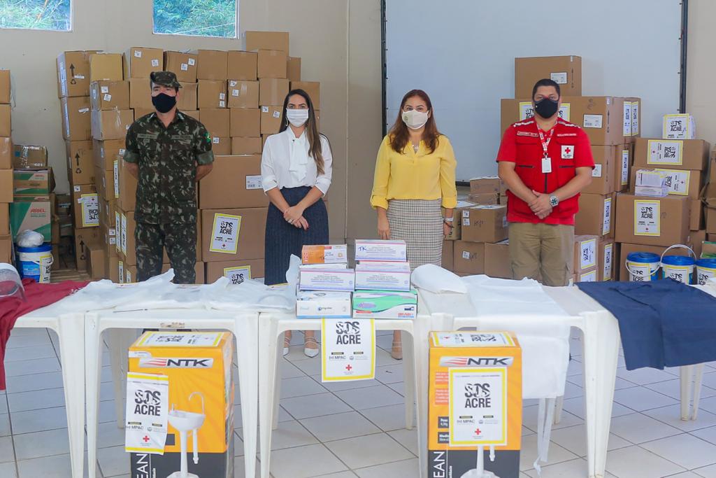 Na manhã desta sexta-feira, 12, a presidente do TJAC, Waldirene Cordeiro, acompanhada do coordenador de Gestão de Riscos e Desastres da Cruz Vermelha Brasileira, Leonardo Alli, e do capitão do Exército, Torres de Melo, fez a entrega de equipamentos de proteção individual (EPI) e outros produtos à primeira-dama do Estado, Ana Paula Cameli, que serão destinados ao INTO.
