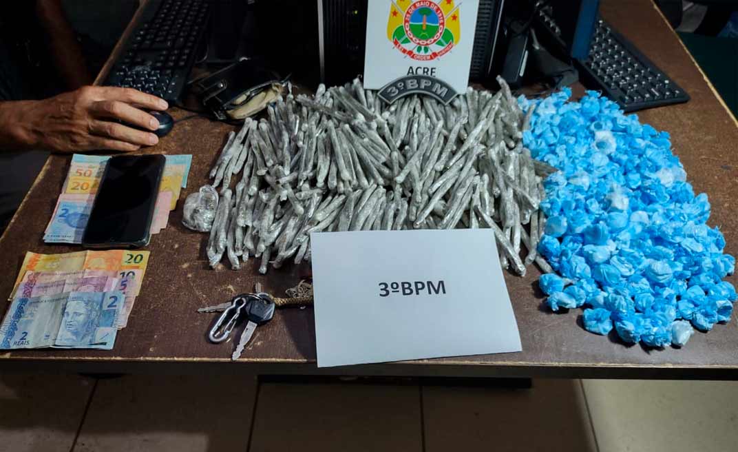 Uma abordagem feita no Km 8, da Estrada de Porto Acre, resultou na prisão de um elemento que utilizava o serviço de mototáxi para traficar drogas. Com ele, os militares encontraram 216 trouxinhas de cocaína, 371 tabletes de maconha, celulares e R$ 749,00.