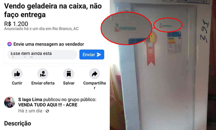 Na publicação feita em Rio Branco, o vendendo anuncia o eletrodoméstico pelo preço de R$ 1.200. A geladeira ainda apareça na caixa e com selo da Energia.